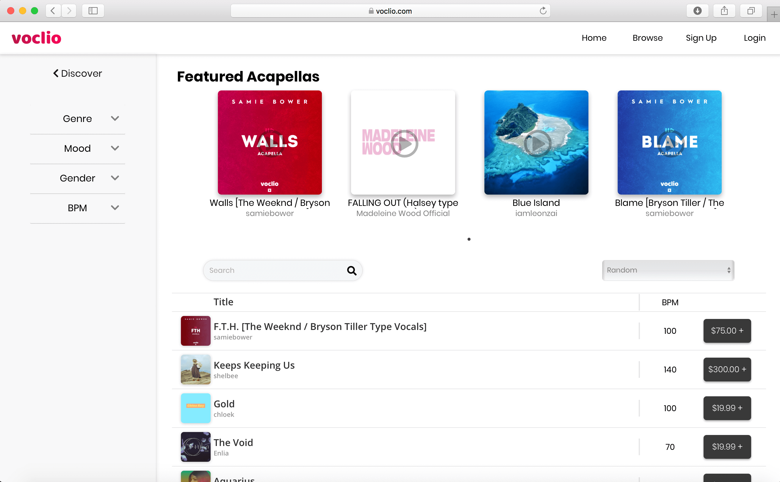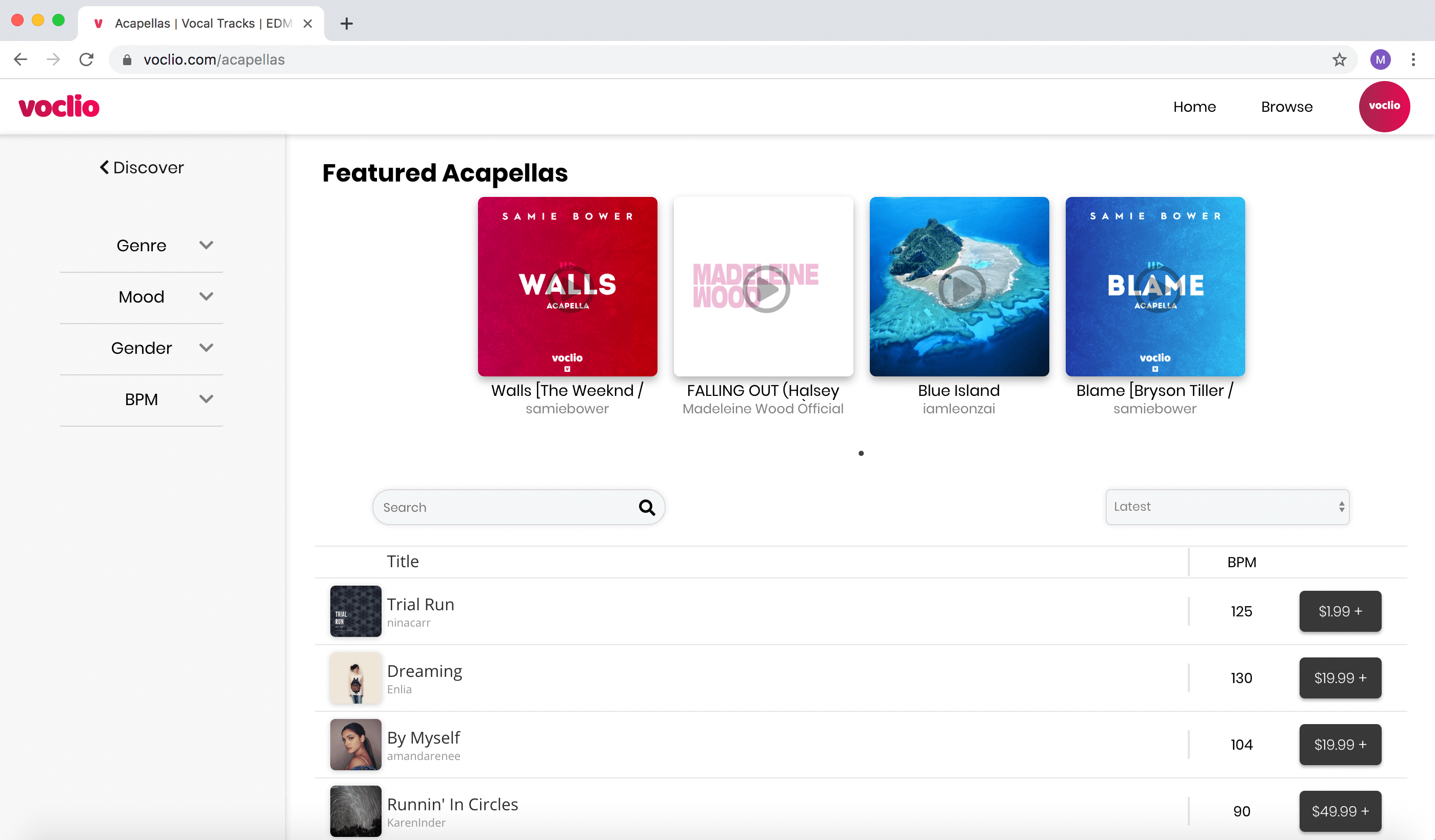 Browse and purchase acapellas created by top singers from around the world. Use them to create original music that you can release and profit from.